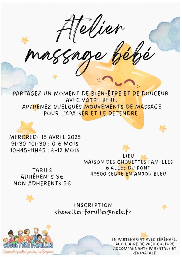 Pour les parents de petits bébés, nous vous proposons un atelier massage mercredi 15 avril, avec Sérénaël (https://www.serenael.fr/).